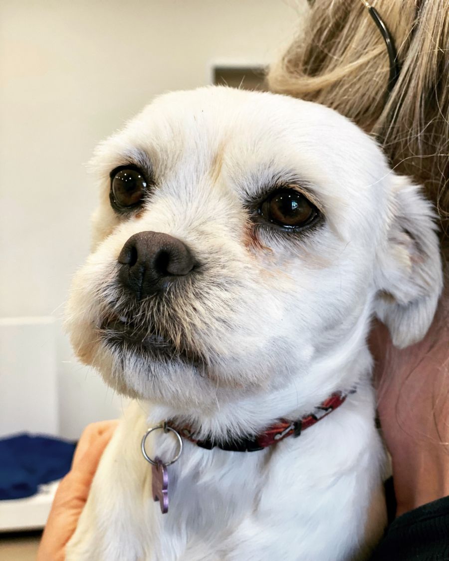 Peaches is a gentle and timid 2 year old Maltese Shih Tzu with the cutest underbite and a submissive smile to boot. She has had her fur shaved, but ordinarily sports a longer coat.