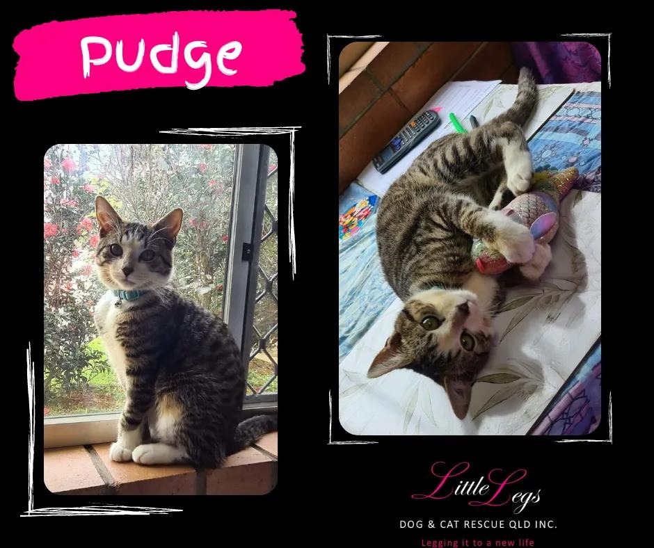 Hi my name is Pudge. When I came into care I was super skinny and always hungry, which meant that I would eat anything and I still will. I'm certainly not a fussy eater and will gladly share anything you have to offer me. I love to be where you are I'll explore every inch of the room you're in. Every morning I greet my furry foster brothers, both the dogs and the cats, with head rubs and purrs. I'm always up for a game of chase with any of the toys we have - whether you're throwing a ball or running crazily to get away from me as I chase the feather on a string. I'm a little shy at first but if you sit still and offer me food I'm all yours. My foster family say that I give the biggest purrs they've ever heard for such a small kitten. I can be quite mischievous and if you leave a shopping bag laying around then go to pick it up you may just find you'll have to ""let the cat out of the bag."" I love to be outside on a harness or in my cat enclosure, so if you like the garden I'll lay down next to you and explore all the things in the garden and the grass and around the trees - but please bring me in when you go inside because I just want to be with you. If I sound like the right cat for you please put in a request to come and meet me. My foster family would love to meet you too.