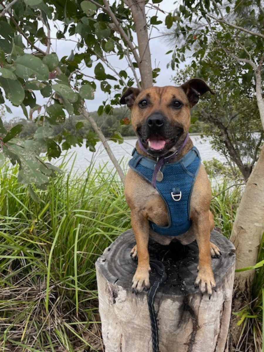 Megsie is a lovely natured cattle x staffy aged 4 years who adores people . She is a solid strong dog and unfortunately too strong for her senior owner who loves her dearly but has asked PVDR to find Megsie a new home .
