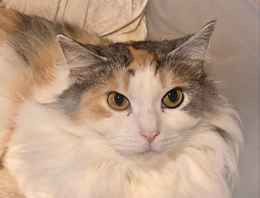 Sally Soft is a stunningly beautiful two and a half year old long haired dilute calico girl. Someone dumped this sweet cat at a factory in the western suburbs and a kind employee found her. She went to a vet and through the pound system and was given to us to rehome. She was traumatised by her time in the pound but is very slowly coming out of her shell with pats and treats. She is super fluffy and has a tendency to develop dreadlocks, so will need an adopter who can help with her grooming - she does allow her mats to be cut out and a gentle brushing. She is quiet and introverted and would like a quiet home with pillow-filled boxes and a human who will speak to her with gentle words. Sally is worth taking the time and effort to get to know, she will bond with her human and be loyal and loving for life.
