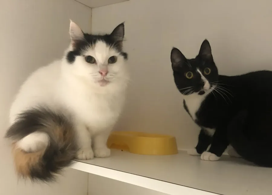 Sabrina and Lulu are both very shy cats, and in fact Sabrina is more shy around people than Lulu is. Lulu is very curious and very playful, and while they don’t play much during the day while we are here, their toys and play area is very disturbed when we get in each morning. It’s possible that over time Lulu may become a little more interested and integrated with her hoomans, but it is unlikely Sabrina will ever want to be picked up or maybe even patted, which is something you would just need to accept about her. With Lulu being slightly younger, she may well adapt a little more than what Sabrina will.