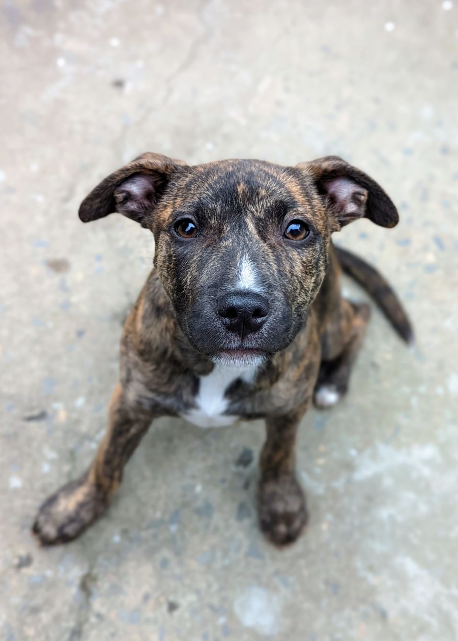 Boo is a brindle and white staffy x who is estimated to be 10 weeks of age.