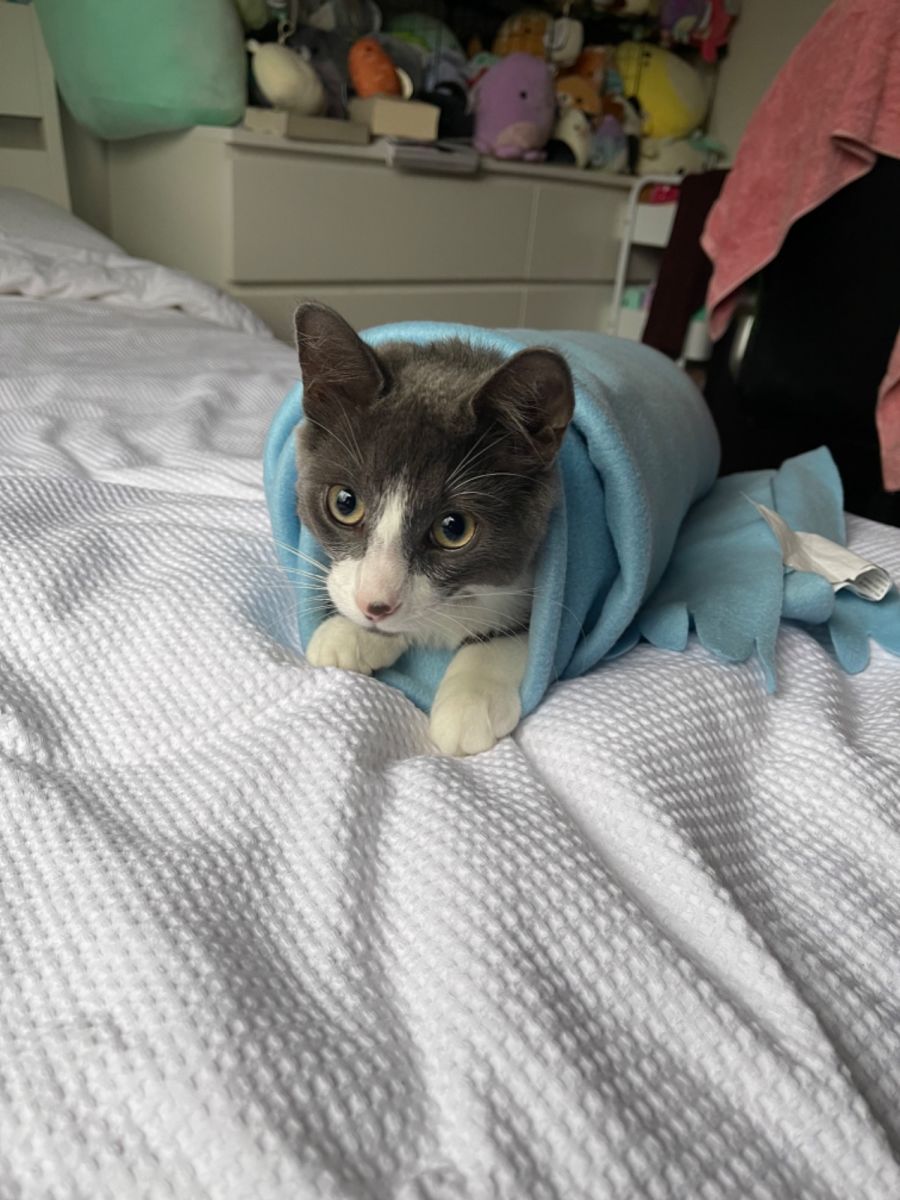 Toby is a gentle and playful grey and white cat that loves a good snuggle. He’s a very affectionate cat and will come up to you for pets, especially if you put your hand out. He may plop right on top of you and purr up a storm whenever you're chilling on the couch or bed. Toby is great with guests and warms up fast when given a bit of patience and with toys and treats around. He has never bitten a guest or owner out of aggression. He loves to hunt and chase his toys and especially loves dripping taps. Toby loves his food and is a fast eater, eating everything that’s given to him. After a good feed, he loves a good sleep in the sun. He doesn’t meow much but will meow when he wants his presence known.