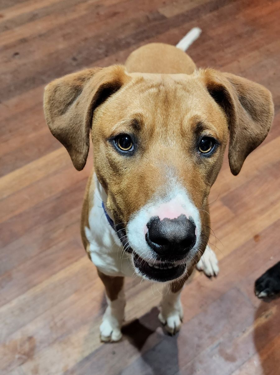 Johnny is an 6mth old foxhound x. He is a happy go lucky boy who loves other dogs and will play with anyone who looks at him. Johnny is currently living with 12 dogs and they all love him. He is a delightful boy who loves a chat and talk to you when he has something to say. He is learning how to catch a ball. Johnny is a great family dog as he is great with kids.