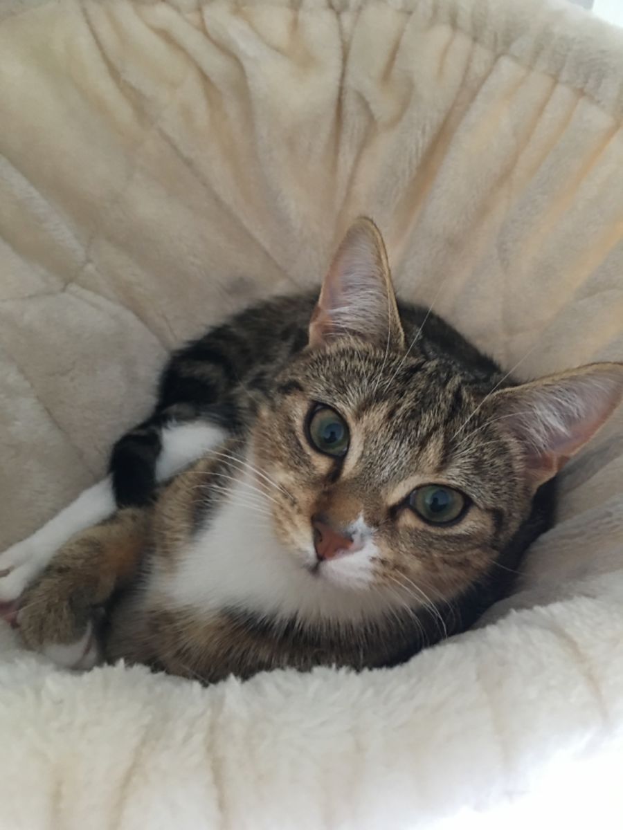 Jalfrezi and her “curry” siblings came into our care at 6 weeks old after being dumped in a box outside a vet clinic. She was very scared but has blossomed into a cheeky, affectionate little ratbag. And just look at how pretty she is!