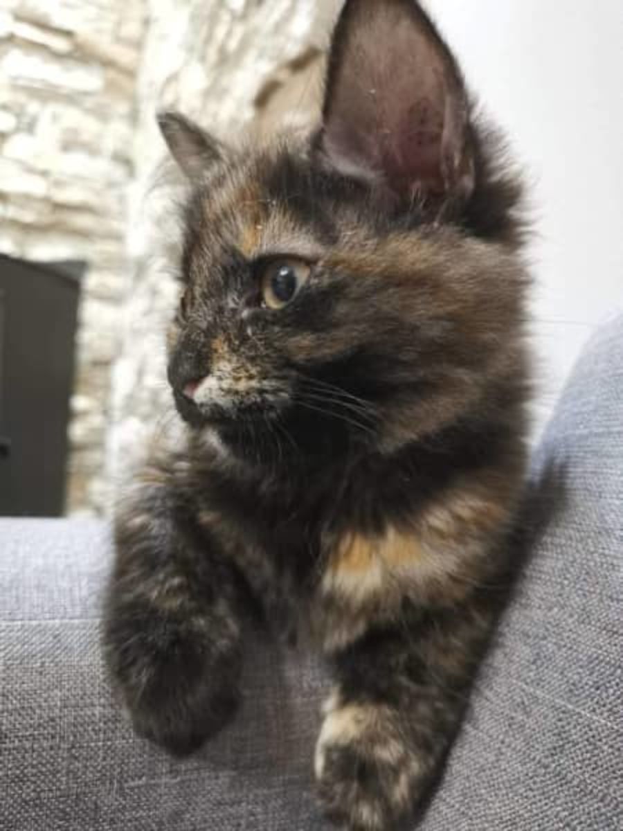 Sophie is a tortoiseshell female with a gorgeous fluffy coat. She is a little shy but as soon as she feels safe she will follow us around and purr and loves back scratches. She loves to play and will easily switch into zoomie mode and play with her toys. Sophie is currently fostered with a large family that are getting her used to being a loved kitty. She sleeps on a bed at night and spends all day hanging out with her sister and 2 brothers. She is available for adoption or if possible a dual adoption with one of her siblings. She would suit a house with adults or older children.