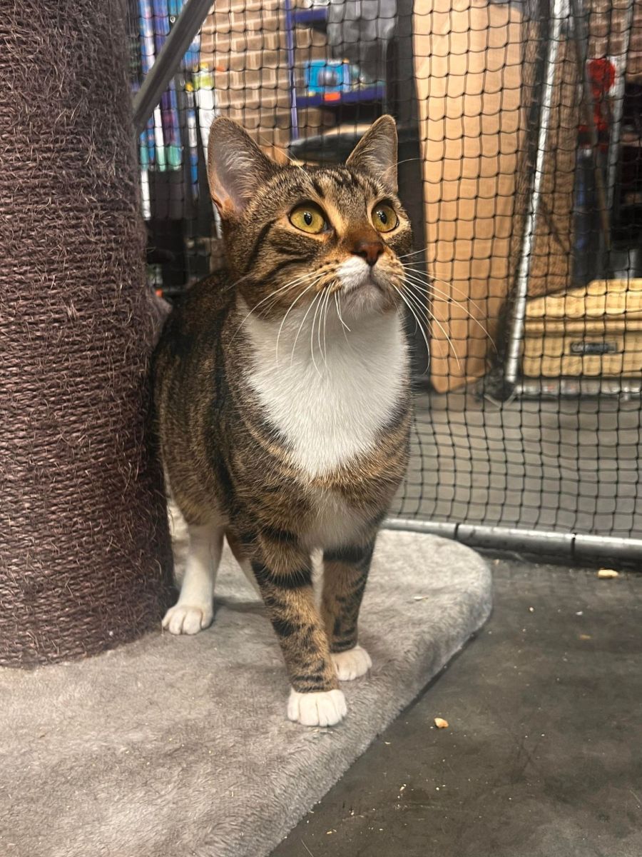 Salam is a sweetest young male tabby we just can't understand how this handsome boy hasn't found his forever home yet. He adores attention and just wants a family he can snuggle with. He loves to play with his toy balls with bells in them, he is also happy to be independent and spend his days relaxing on his cat scratcher.