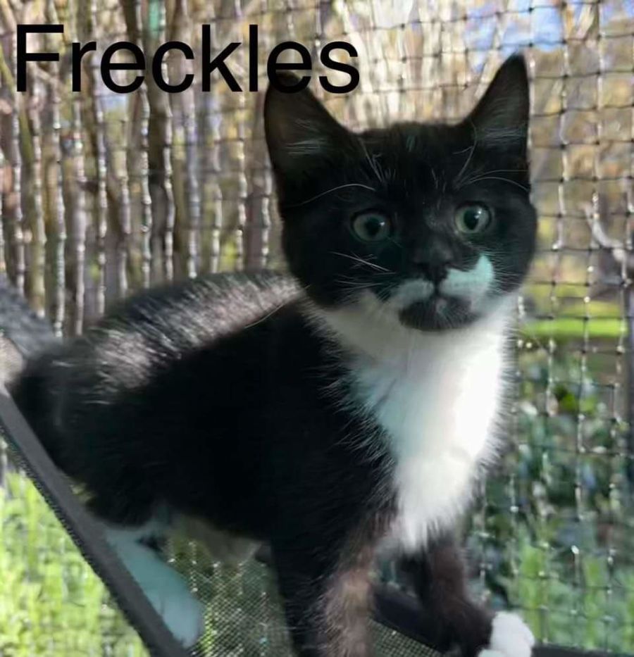 Freckles has been in foster care with teenagers, a cat and a dog. She is an active and playful kitten.