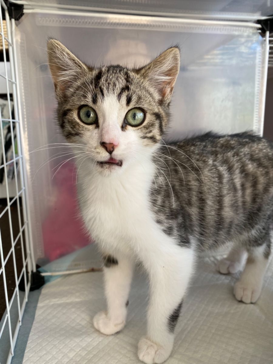 Jace is approximately 13 weeks old and came into care with his 5 brothers and sisters. Jace is a quiet little gentleman with a massive drive for food! This is the way to his heart. Jace will benefit from a quiet home with mature children who won’t frighten him. He is nervous around people and new environments at first, but will warm with continued consistent one on one interactions. Jace has been in care alongside other cats, big and small, as well as dogs. He loves his kitty friends, but would need slow introduction around new dog friends. This sweet boy has never shown signs of aggression since he has been in care, not a single swipe, hiss, growl or nibble, he is very calm and mostly enjoys lying in a sunny spot where he can sun bake and nap.