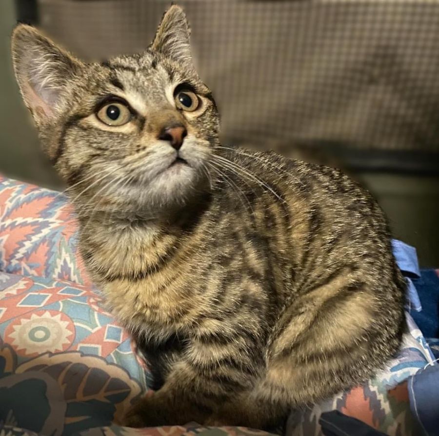 He has a gorgeous mackerel coat, and beautiful eyes. He seems to like other cats, and is slowly accepting small dogs. His personality will no doubt develop as he feels more comfortable.