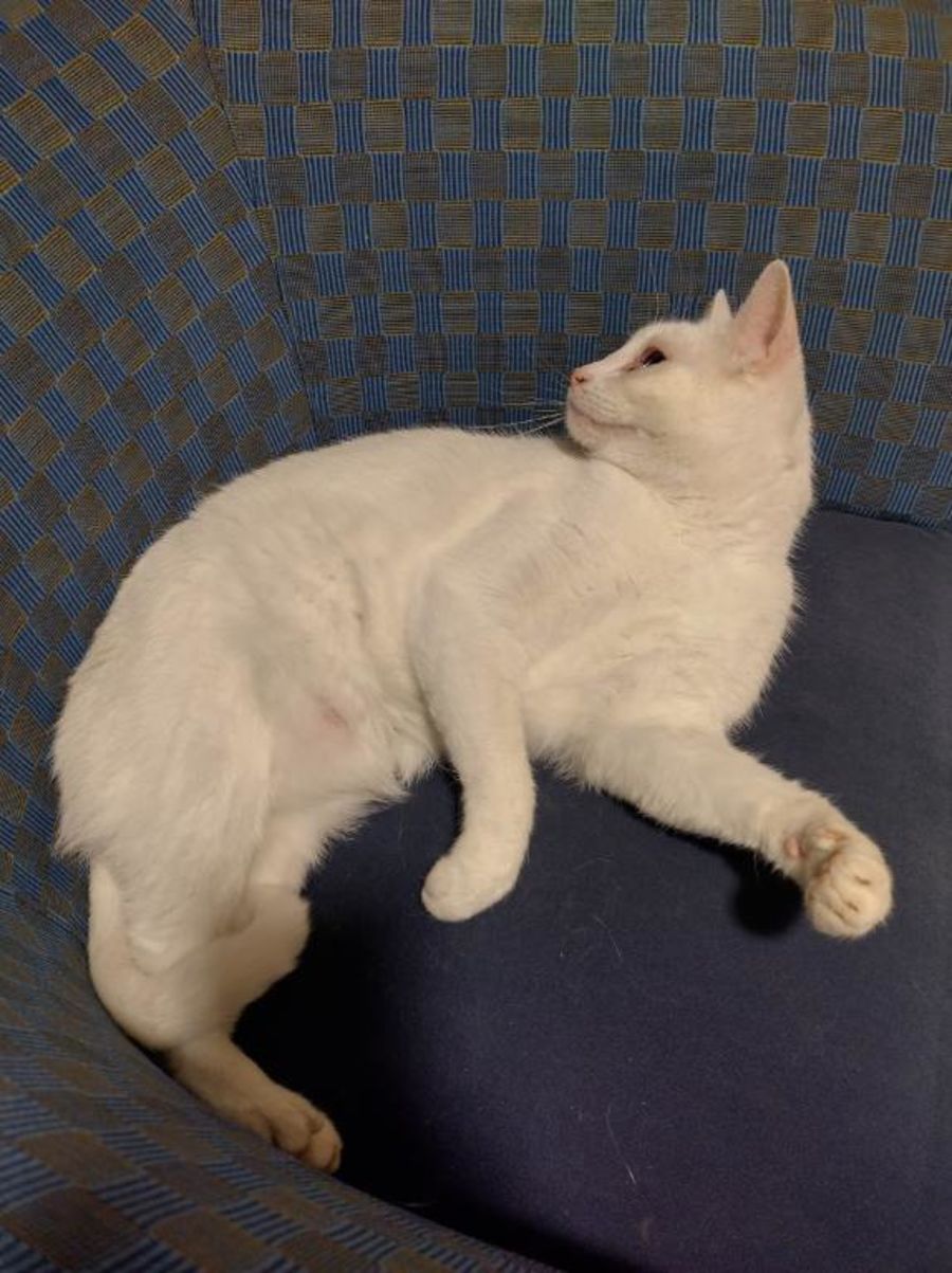 Lagertha (Angel) is a beautiful calm and affectionate cat. She is nearly 8 years old, desexed Khao Manee. Lagertha has one blue and one green eye which is normal with this breed. She