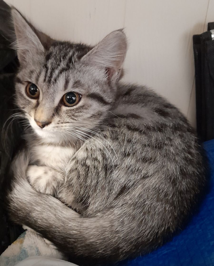 Molly is one of 5 kittens that just love playing together and sometimes just entertain themselves with kitten toys. Molly is a medium hair tabby, beautiful and soft. She is a little dynamo that just keeps on going, a typical healthy little kitten. She eats well and is litter trained. If you think you can offer Molly the home and love she deserves, phone our carer John to arrange a meeting