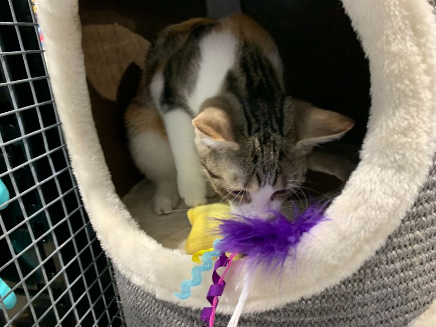 Although shy at first, Pinstripe will be requesting pats and cuddles in no time once she’s settled in. She’s come a long way in foster care and building her confidence, but new people and spaces can still be overwhelming for her. Once she gets to know you there will be no stopping her in being vocal about requesting all those chin scratches. She can still be a bit timid of getting picked up but once you’re cuddling her she’ll settle in and start purring away. All Pinstripe wants is someone to give her the attention and love she deserves. This sweet girl will also need plenty of little toys to carry around in her mouth, maybe one day she’ll even play a game of fetch with you!