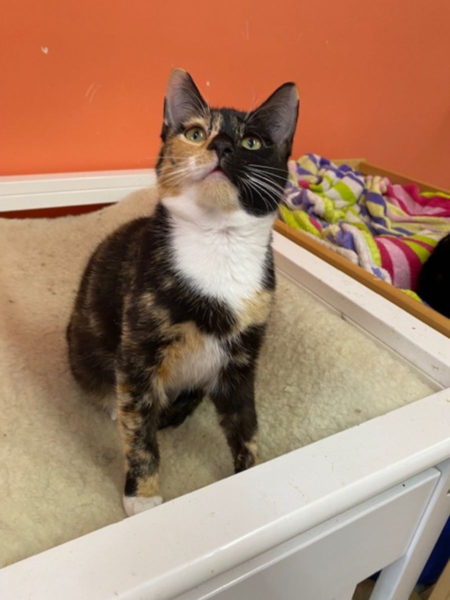 Isla is a striking sweet girl with the prettiest coat. She is a tortoiseshell with white and has one of the most remarkable and unique faces I have seen. She is a little shy and think that on any given day there is so much activity going on around her that she prefers to sit back and watch all the craziness happen around her.