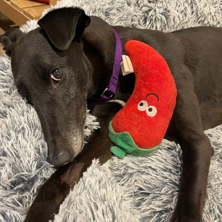 She loves soft squeaky toys and will happily play with them and fling them around her bed. She travels well in the car and can leap in and out unassisted.