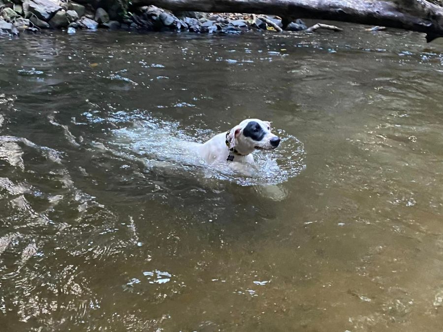 Melby is house and crate trained and she sits for food. She walks well on a lead and loves the creek! Her favourite thing is to find a high spot to jump in water and she’ll swim for hours if you let her. Later, she will settle at your feet and fall asleep next to the couch.