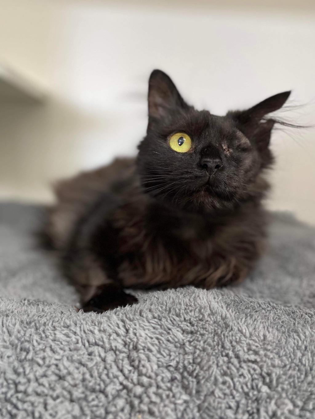 "Hello, my name is Cali. I might have just 1 eye 👁️ but I will quickly seek you out so I can sit in your lap and make cute noises 🎶. I have been told I am extremely sweet and affectionate and I'll happily walk over to greet you, with my 3 little legs. Yes, I'm also a tripod but it doesn't slow me down too much.