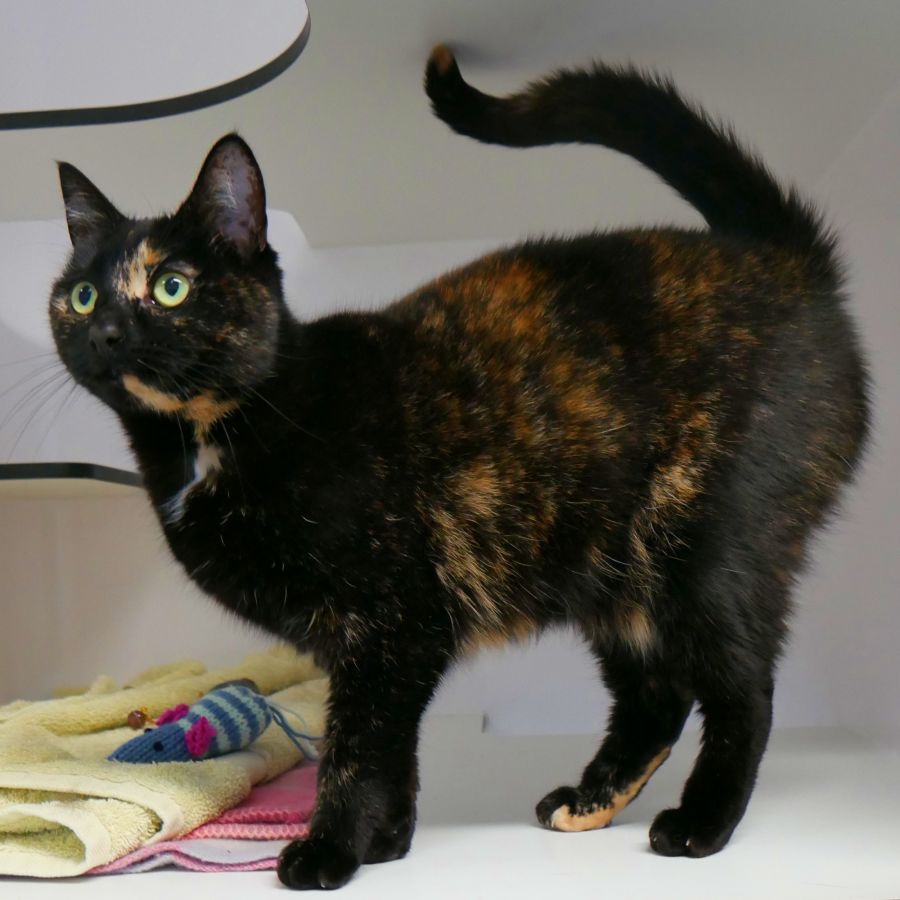 Blaise is a stunning girl who does not enjoy new environments or meeting new people. Once comfortable and settled Blaise is shy but affectionate and loves a lap to curl up on. She does know her mind and being a Torti will let you know if she is not happy about something, for example she does not like her belly being touched and will let you know not to do it again.