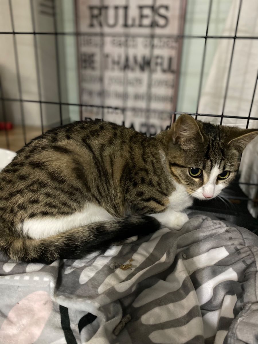 She is friendly & affectionate but she will shy away from you when approached. This will be a thing of the past once she’s comfortable - she will be coming to you in no time!