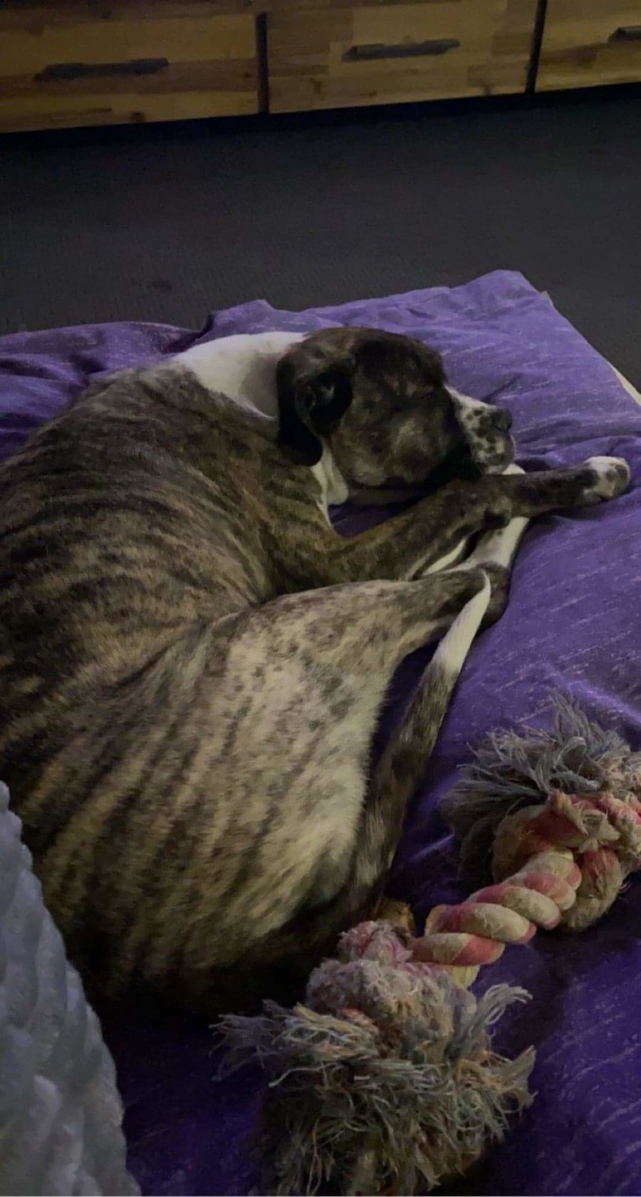 This chunky girl is thought to be boxer x Bulldog she is a tad shy but definitely gaining confidence and starting to be the cheeky pup she should be.