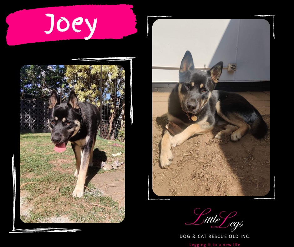 Strong Breeds: Joey is a Rottweiler, German Shepherd and Siberian Husky mix. These three breeds are strong, active and stubborn breeds. An experienced dog owner is preferred.