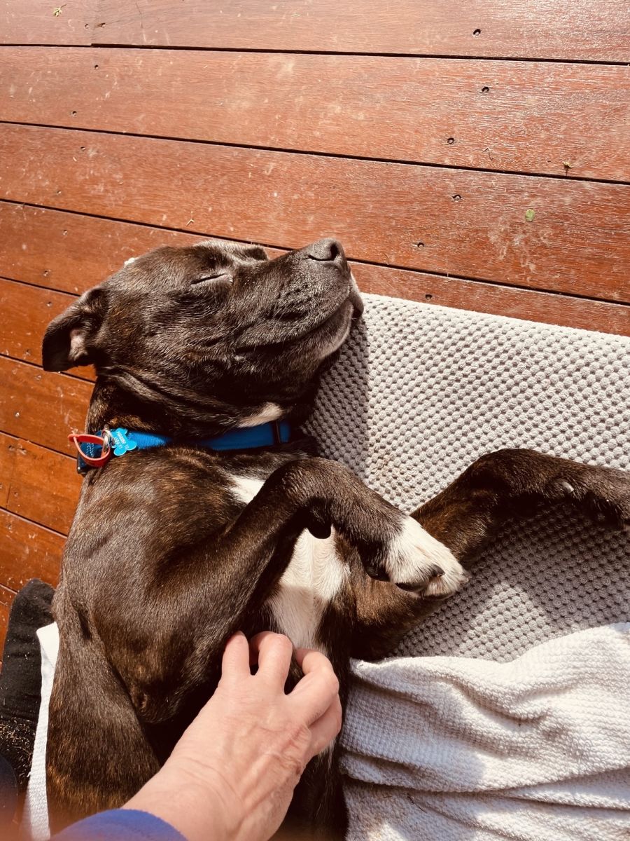 Ronny has almost a “purr” which we think staffy owners will be familiar with, when you fuss with him. He LOVES his chest being stroked and will back into you to encourage pats and attention, and lean on you for a cuddle when you sit. But he will also stop if told to.