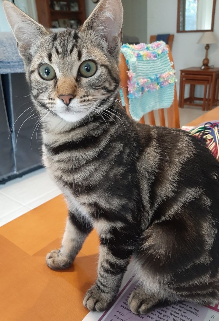 Who loves Tabby cats??? Little Miss Evie is a true example of the classic tabby with the "m" on her forehead, the butterfly pattern on her shoulders and all the spots, circles and stripes are duplicated on both sides of her shiny soft coat.