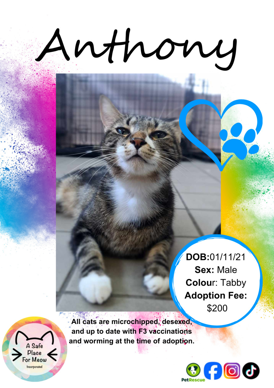 Anthony may take a little time to warm up to new surroundings and faces, but once he trusts you, he’s an absolute sweetheart. To the right person, Anthony loves affection in all forms. Back scratches, kisses, belly rubs - you name it! At times he will even flop down at your feet asking for more love