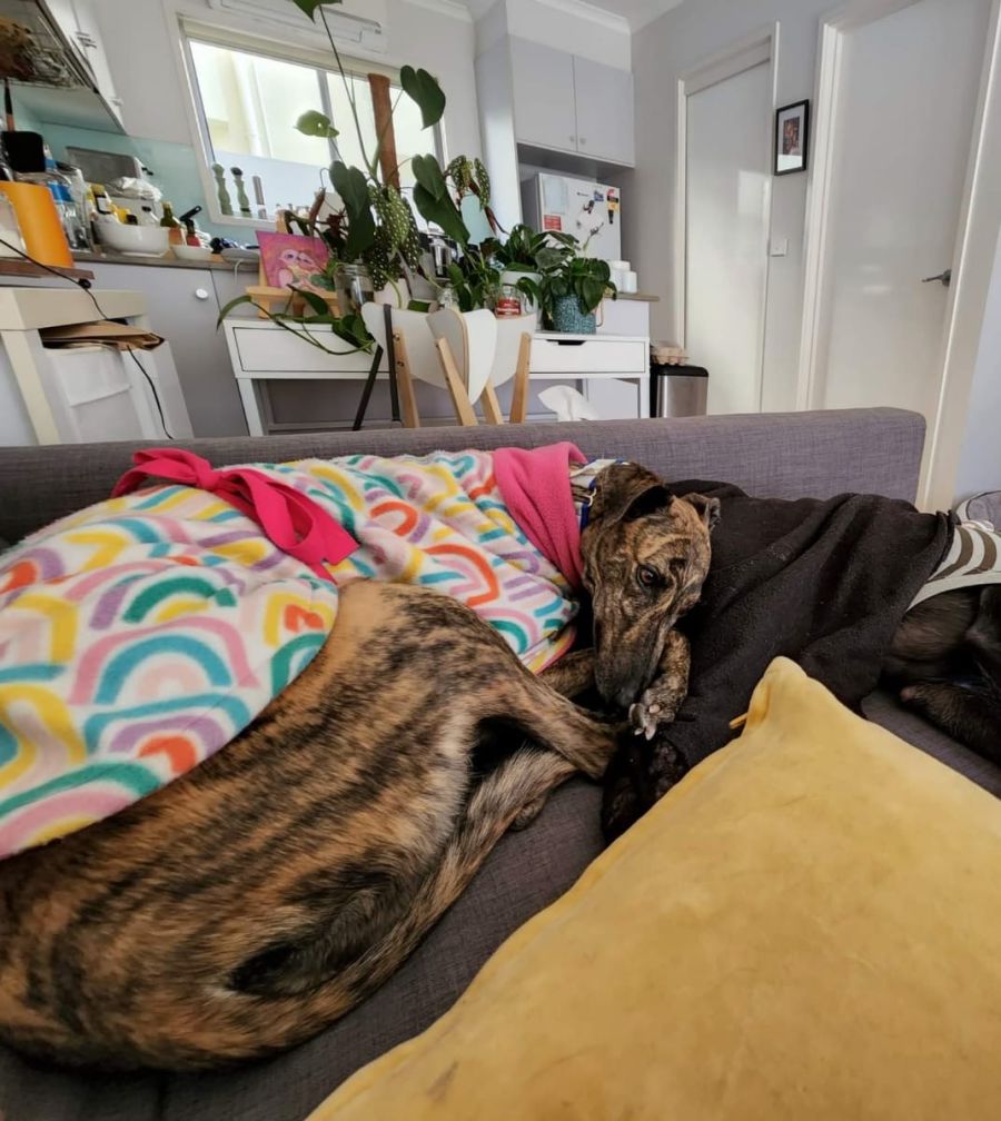 Out and about, Amber has been fine walking past polite hounds but has not had a lot of interactions with many dogs as she is still a bit anxious and developing her confidence. She has been joining our other greys at the Coburg market, and this has helped her confidence immensely, but she will need slow and polite introductions to other dogs. She would love someone who is around more often than not.