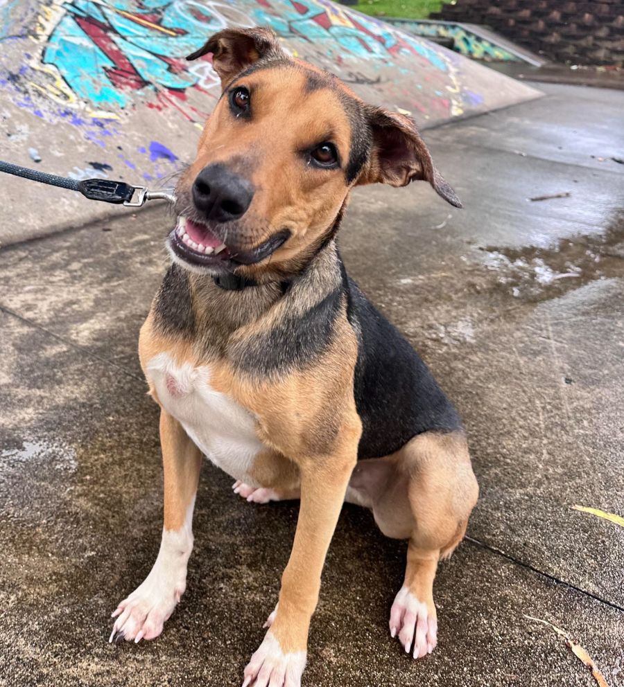 Mykel is young, smart & super sweet. He responds well to treats and praise. He's super keen, gets excited & in trying to show you he's ready for whatever you're going to do, can be jumpy. With gentle reminders he'll calm down & wait. He doesn't do well on his own and will need a fur sister or brother for company. He sleeps in a crate at night and is coming along nicely with his leash manners. He's impressed his foster Mum with what he's learnt so far; waiting to go through a gate or doorway, staying out of the kitchen when told, staying when other dogs go out the door for their walk are just some of them. He likes having different veges & fruit as snacks... probably more than most kids!