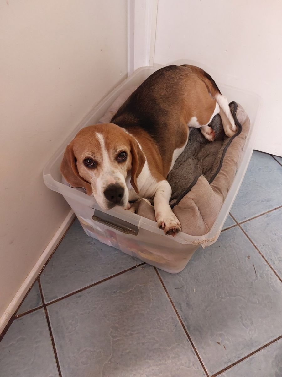For the time she's been here she's getting on pretty well with most of the dogs here Being a typical beagle she is after every ounce of food that is around so everything has to go up, especially the bin, the dog food packets, the cat food and everything because if it's around it's going to get eaten.