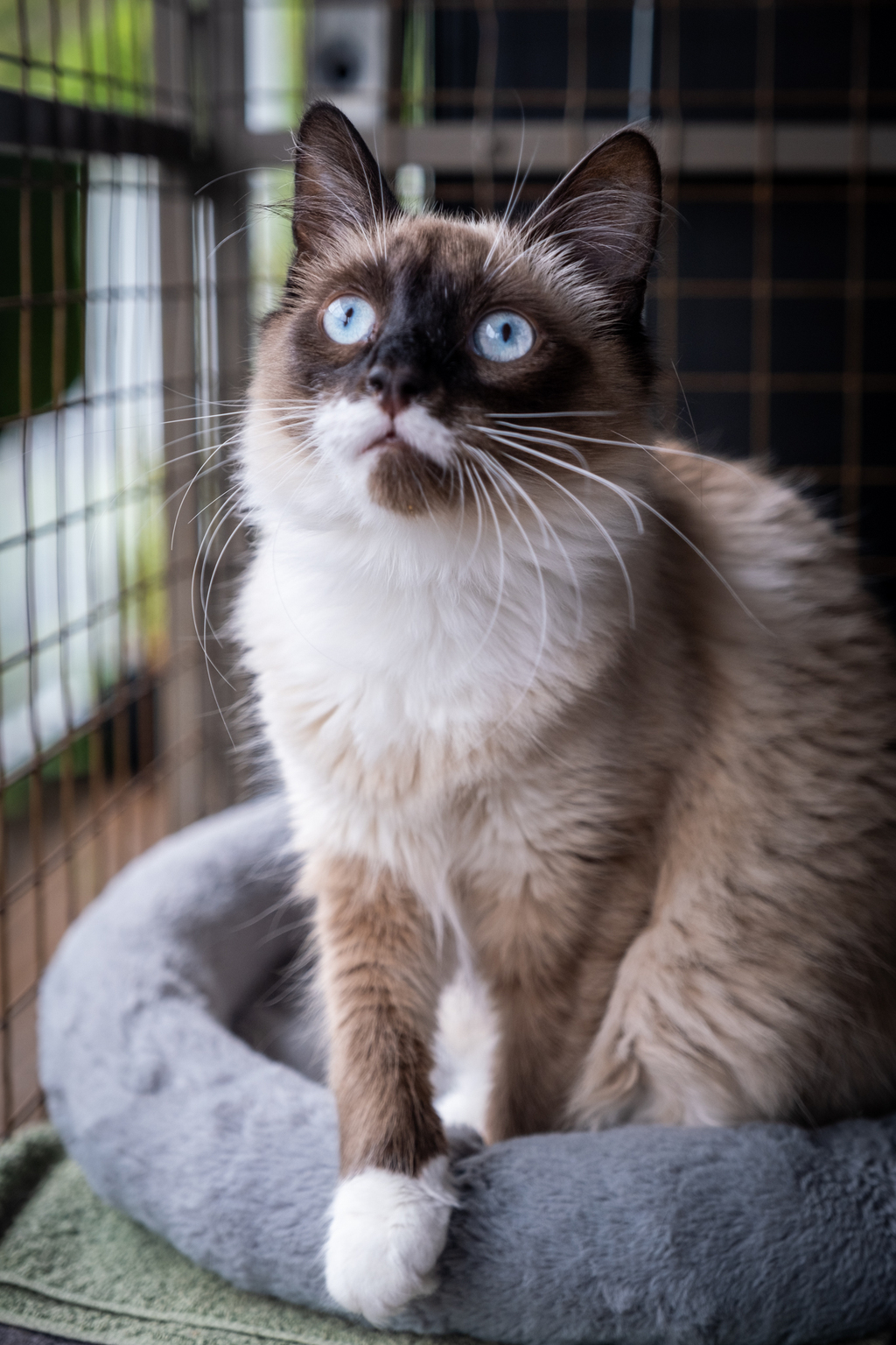 Jinx is a super handsome young man who is not quite 9 months old! He is a ragdoll cross with the cutest little white feet and totally captivating eyes. Jinx has had to be surrendered with his adopted siblings, Tilly and Billy, as their family have had to move into a home with someone with severe cat allergies. They are very sad to say goodbye, but they are definitely gifting their new owners with beautiful, social and loving cats.