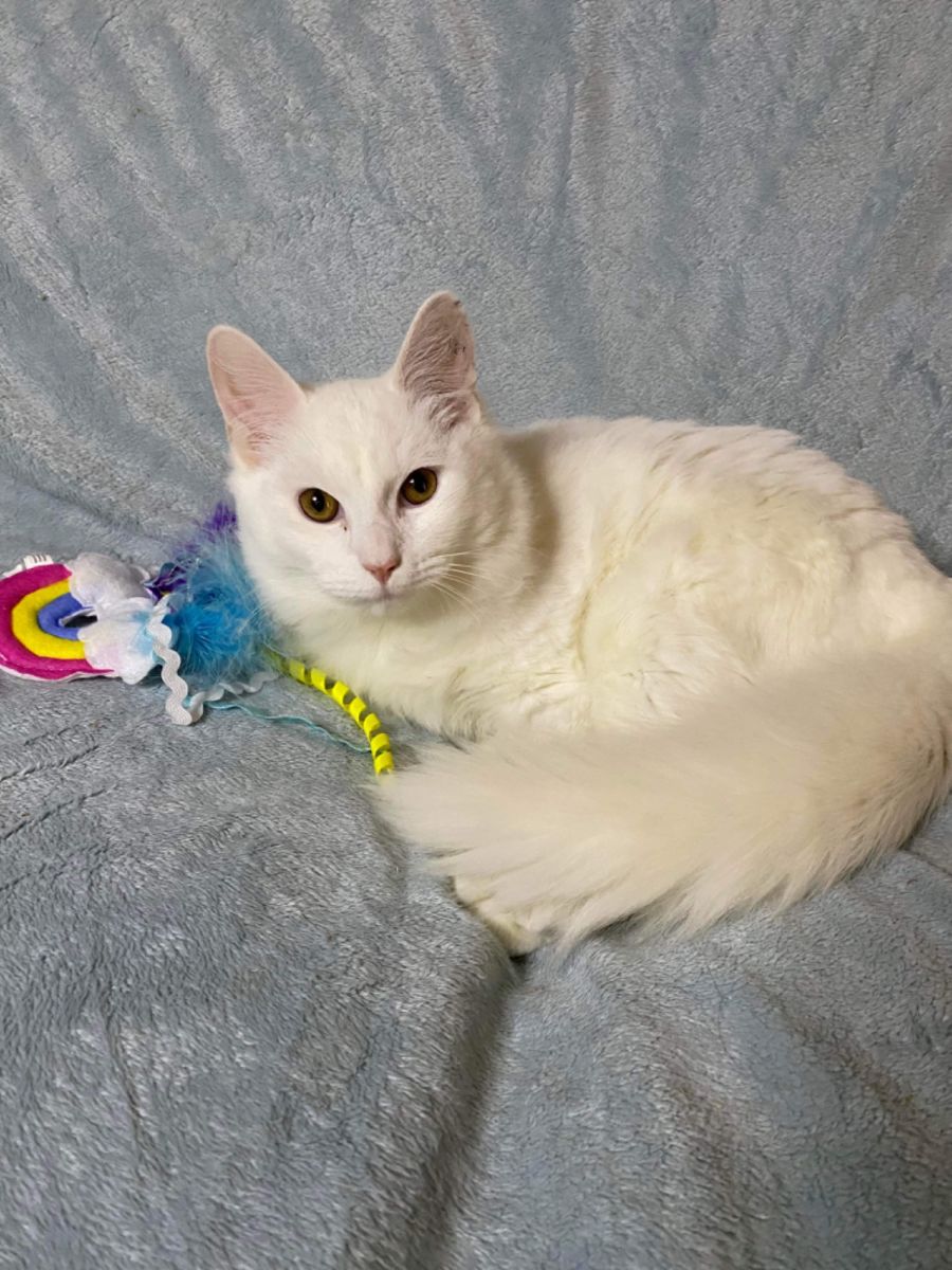 Hale is friendly and playful. He loves cuddles. He is great with people of all ages and good with other cats. He is a Turkish Angora cross.