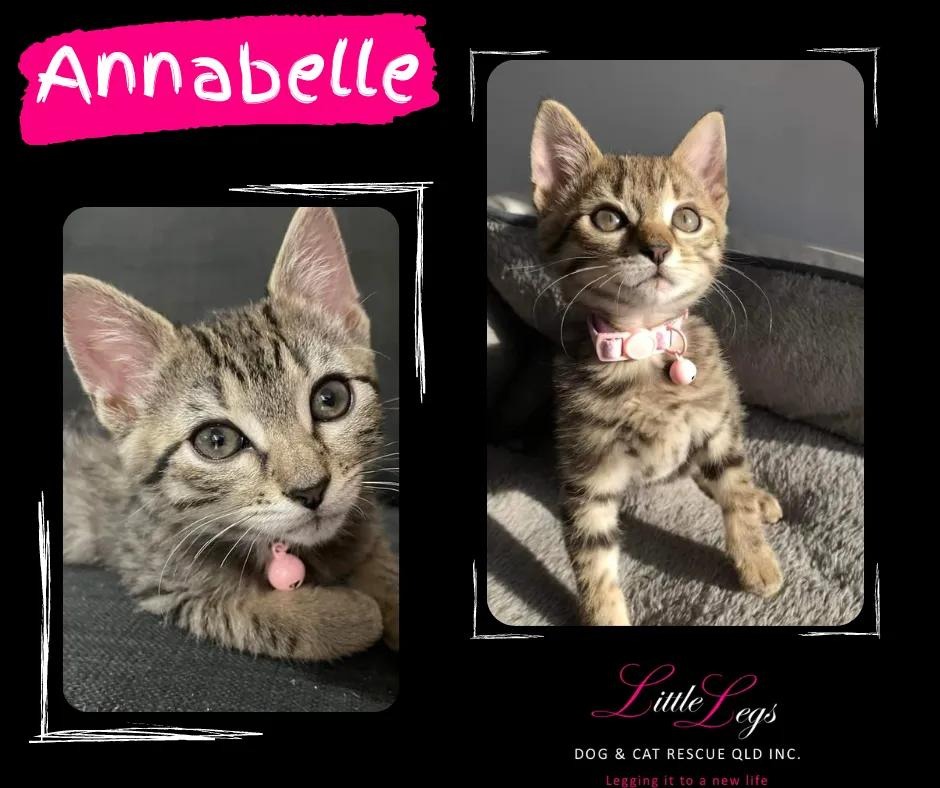 Annabelle and her siblings were saved from death row at a Rural Pound. Annabelle was a very small, scared kitten but soon warmed up and has become very affectionate and loving. She now loves being held and smooched. Annabelle's favourite place is in your arms, laying on you sleeping, however, she also enjoys playing with any toy that makes sounds or rustles. Annabelle LOVES food and is not fussy. She is also a pro at using her litter. Annabelle would love a home that can provide her with enrichment, love, and endless play.