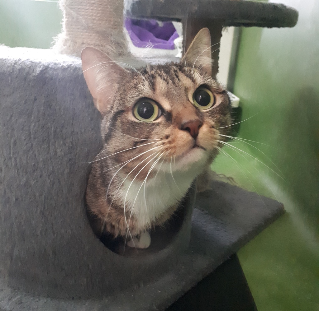 This is Missy! As you can see, Missy is a petite, spotty little cat that loves a good head rub. When it comes to relationships, Missy does not always leap in paws first but if you give her a little time to get to know you, she will shower you with purrs, head-butts, and plenty of lap time. Missy is a cat who likes to relax and would prefer a quiet mature home. Missy is a naturally shy, curious and independent feline. But if you take the time to win her trust, she will be your devoted companion!