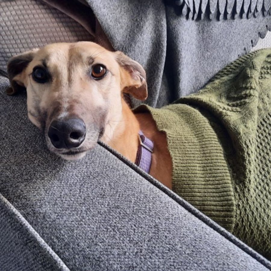 Kane has the adorable greyhound trait of borrowing items from his humans to decorate his bed. Pillows, tea towels, socks and shoes have all found their way to Kane's big comfy bed. Thankfully he is just a collector and no damage is done! He happily lollops around in the backyard, exploring and sometimes taking a little 'bath' in his foster families old disused bathtub. So far, he has happily spent a few hours outside by himself without any issues.