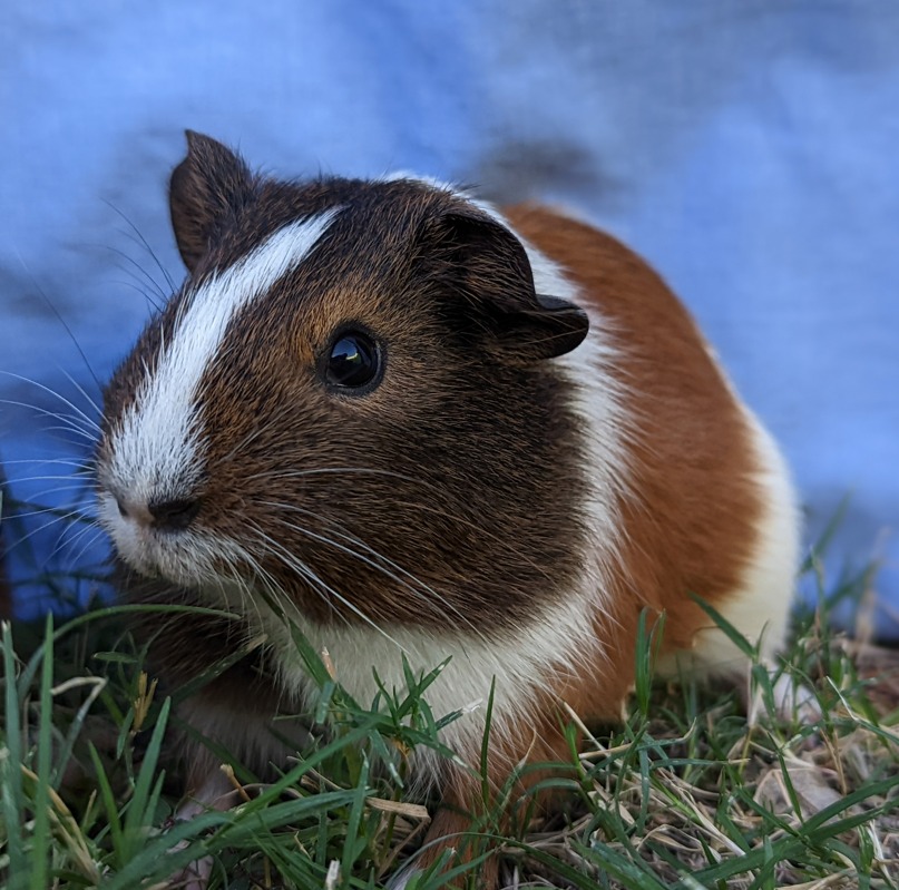 Just like all guinea pigs I love to bury myself under leaves and vegetation. I love tunnels too. I eat a variety of foods - I'm still trying to decide on my favourites but fresh greens every day are a must. We need to be fed twice a day and our diet also includes hay, pellets and washed fruit and veges.