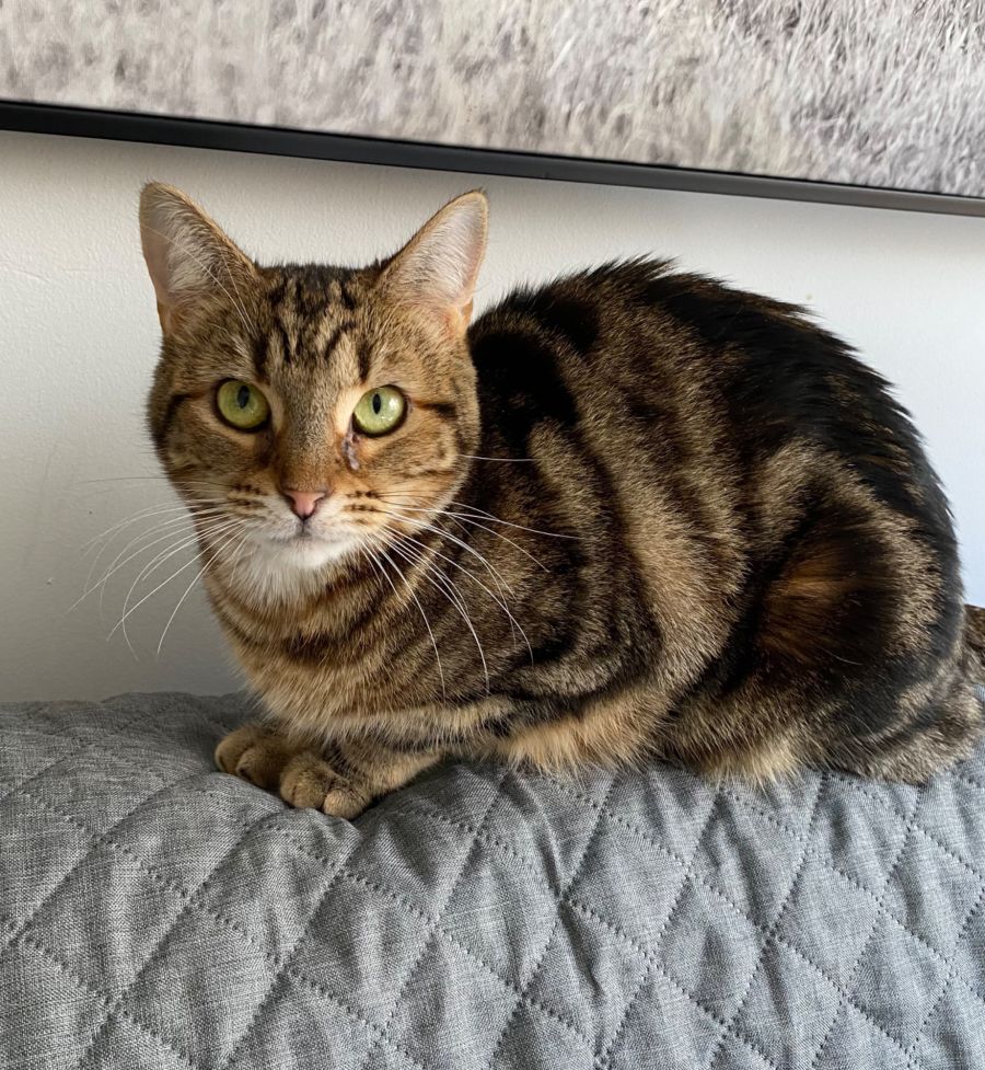 She is such a stunningly beautiful cat! These pictures don’t even do her justice. Her eyes are bright green, she often has a little smile on her face and who doesn’t love a tabby coats?