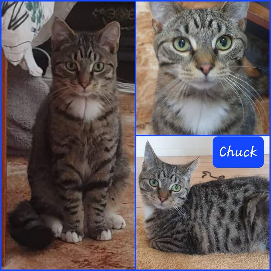 Chuck has grown significantly in confidence. Occassionally he can still be a little unsure of noises and lots of activity. He would be well suited to a quieter total indoor home. Chuck is in foster care with other cats and two foster pups.
