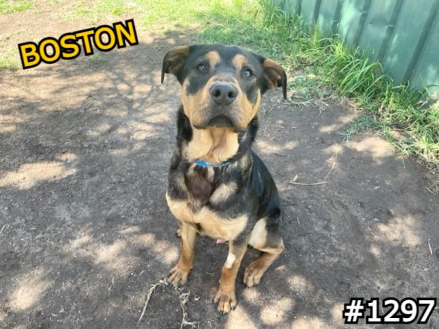 Boston is a Male Kelpie and Rottweiler mix around 1 year old. He came to us as a non-microchipped stray. No owners came forward to collect him.