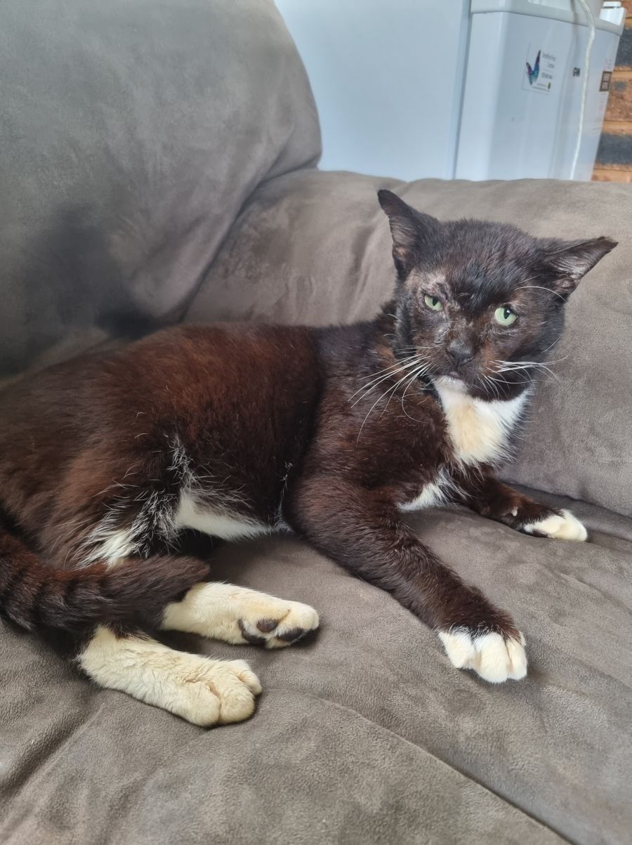 Biggie had his health check and being an older boy who has lived a hard knock life, there were no real surprises. Biggie is FIV positive, it's not unusual in cats who are allowed outdoors. Some of Biggie's teeth weren't in great shape, so his canine teeth were removed, making him more comfortable and to prevent further problems. Biggie's face is healing well, but being such a big wound that he had, the scaring means his hair is a little sparse and will probably remain that way, it just adds to his charm though. Biggie has had some flu like symptoms, and has a slightly irritated eye, which could possibly have been related to his original wound, however, his carer thinks he may have accidentally done it himself while cleaning, it is improving, and she is keeping an eye on it's progress to report back to vet.