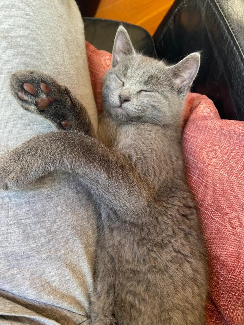 Mugsy loves to play, cuddle and do normal kitten activities (including jumping on shoulders).