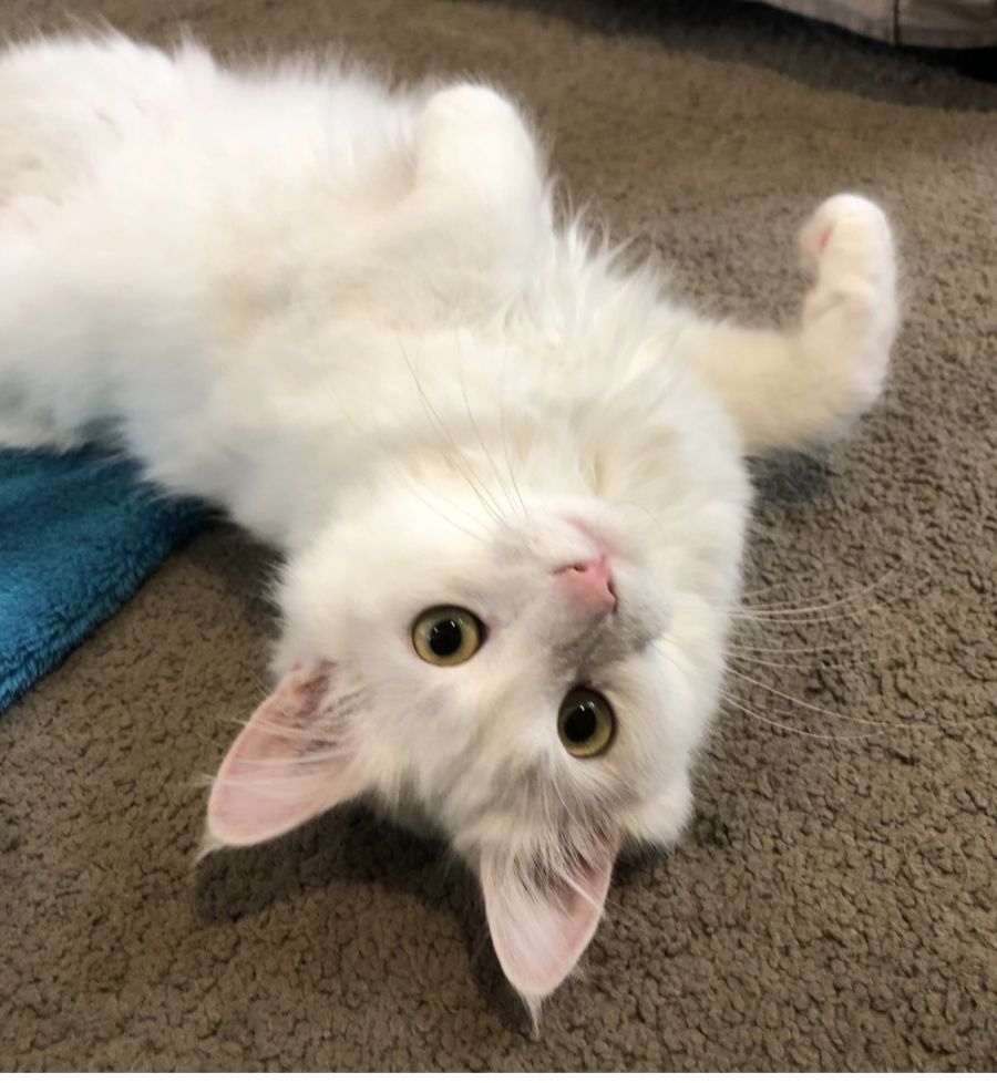My favourite things are catching and walking around with hair tiers and chasing string. I love getting pats on the bit of grey at the top of my head and being stroked all the way down my body. I’ve started to sit next to my humans where they’re watching tv.