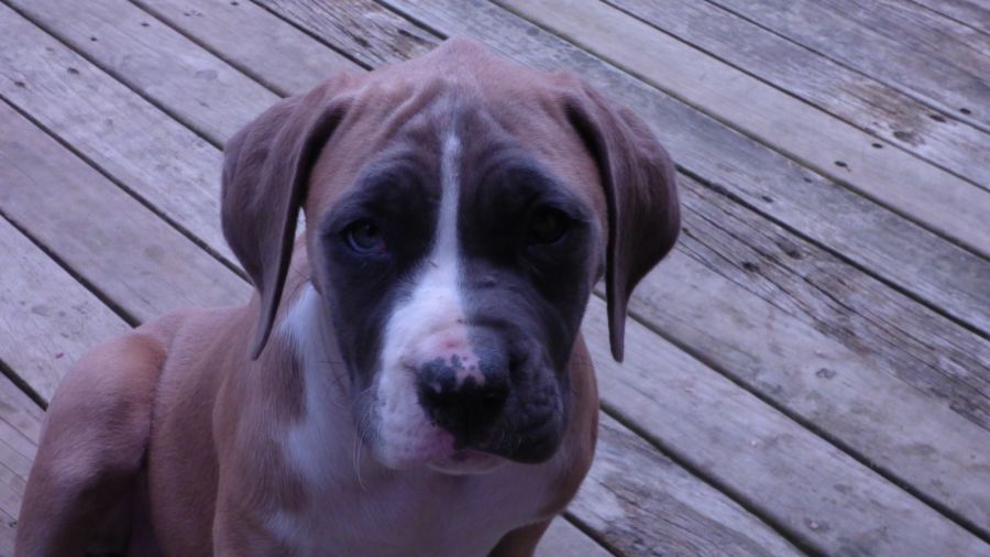 Gabbie is a Boxer X Staffy only 8 weeks old she is a beautiful sweet natured girl, house trained, good in the bath, quiet in the car, sits for both pats & treats. I interested in adopting Gabbie """"CALL"""" Lynne on 0425267391.