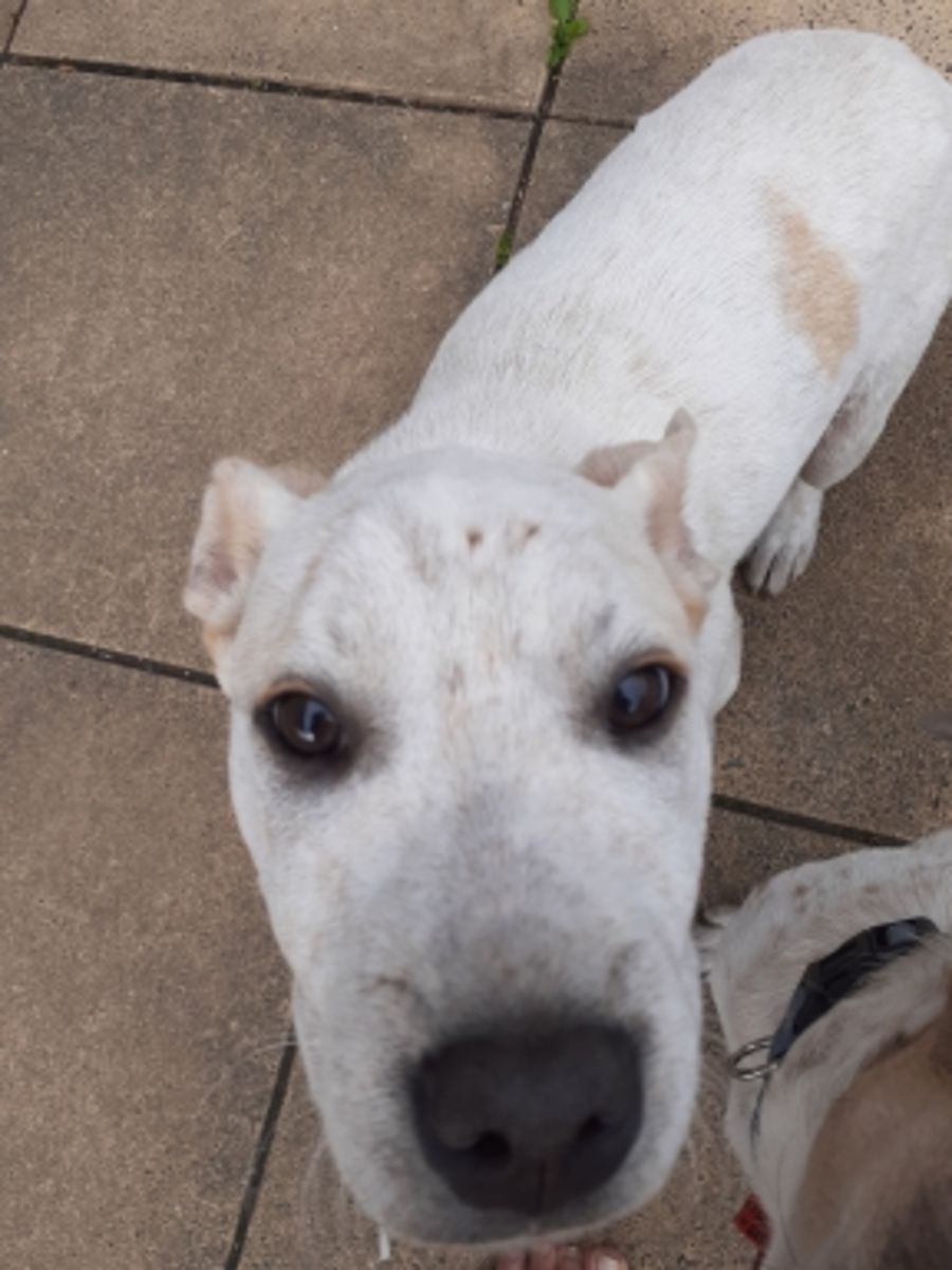 Queenie loves all the pats, playtime and hugs you can give her, especially from children. She enjoys giving snuggles beside you, and jumping up to get closer to lick faces, so children old enough to teach her to behave will be suitable.