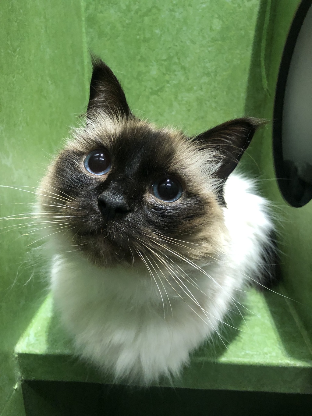 This is Sweety. As you can see, Sweety has striking blue eyes and a beautiful soft coat. Sweety would love to be brushed twice a week to keep her looking her best.