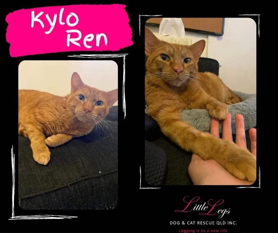 Kylo was saved from euthanasia by a rural pound. For the first few days, Kylo Ren would only eat when he could hide under the couch. Within days, he became an energetic cat who loves breakfast time with all the other cats. Kylo Ren has been desexed and vet worked up and is all healthy and ready for a loving forever home to show him that a rough start doesn't mean a rough life. Kylo loves snuggling up on the couch and cuddling, especially scratches around his neck and ears.