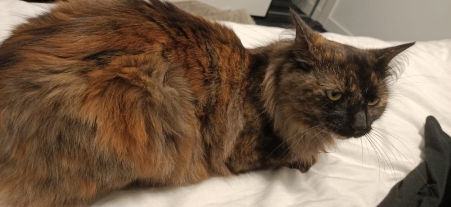 Bella is very sweet, affectionate and gentle girl who would be good with kids. She likes scratching posts and sometimes playing with wool or dangle toys but also loves to snooze all day while the humans are working . She trusts humans and is comfortable with us. She loves being petted and is very gentle. She spends a lot of the day snoozing in her various hiding spots (under the bed, in the wardrobe, behind the sofa)