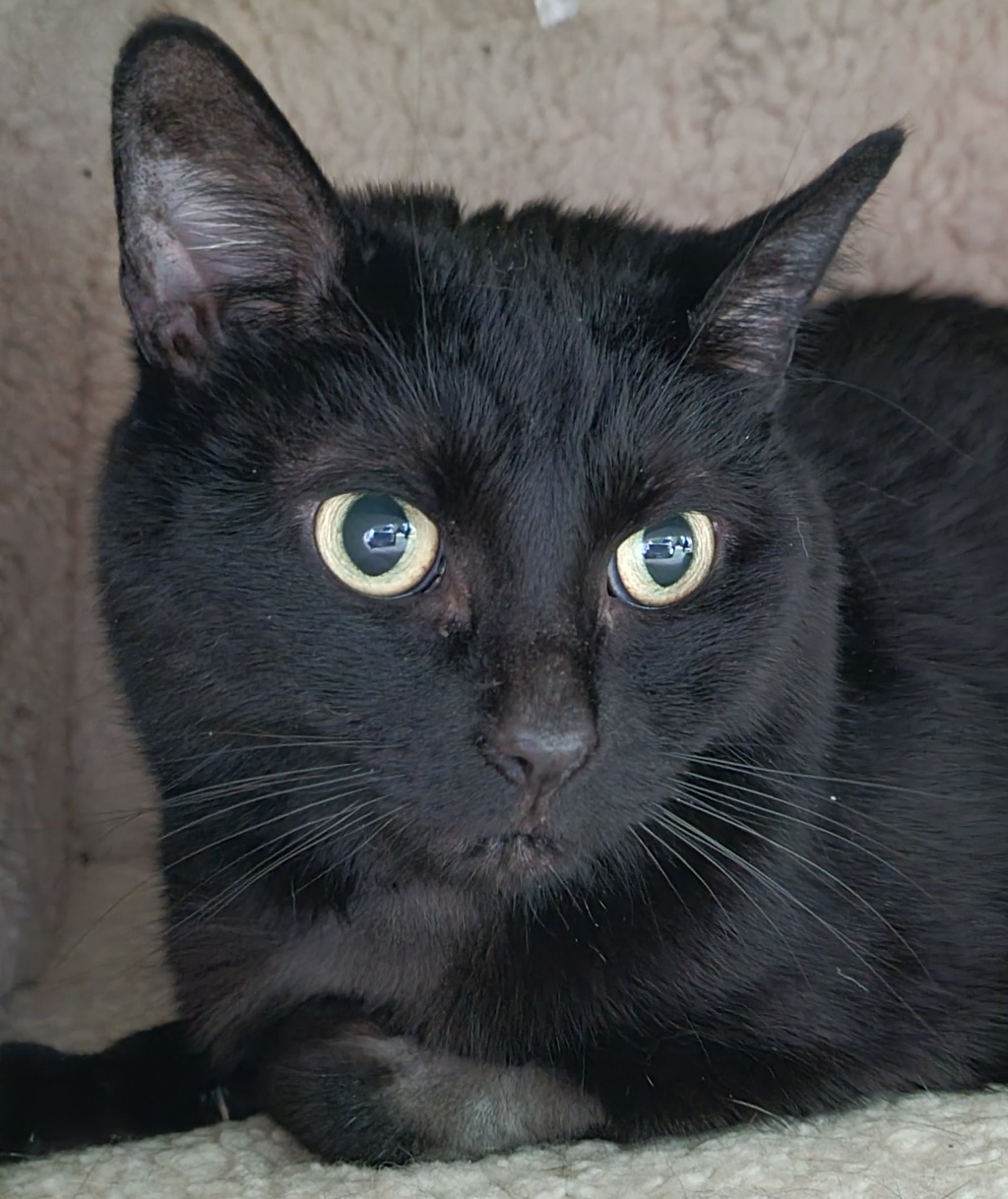This is the lovely Evie. When it comes to relationships, Evie does not always leap in paws first but if you give her a little time to get to know you, she will shower you with purrs, head-butts, and plenty of lap time. She may be okay living with another friendly cat for company. Evie can be shy at first, but she is just looking for someone to love her. With some patience and time, Evie will truly blossom.