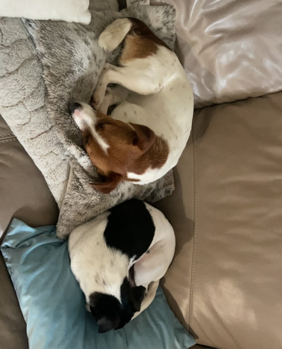 Trixie does well inside or outside as long as she has a friend outside with her, but should sleep indoors in winter and come inside if it's very hot. Trixie is a typical bossy Jack Russell, so a friend who is a little more docile would be best. Trixie will need ongoing social training around other dogs, so a slow and supervised introduction is recommended. She can be a little possessive with toys around other dogs.